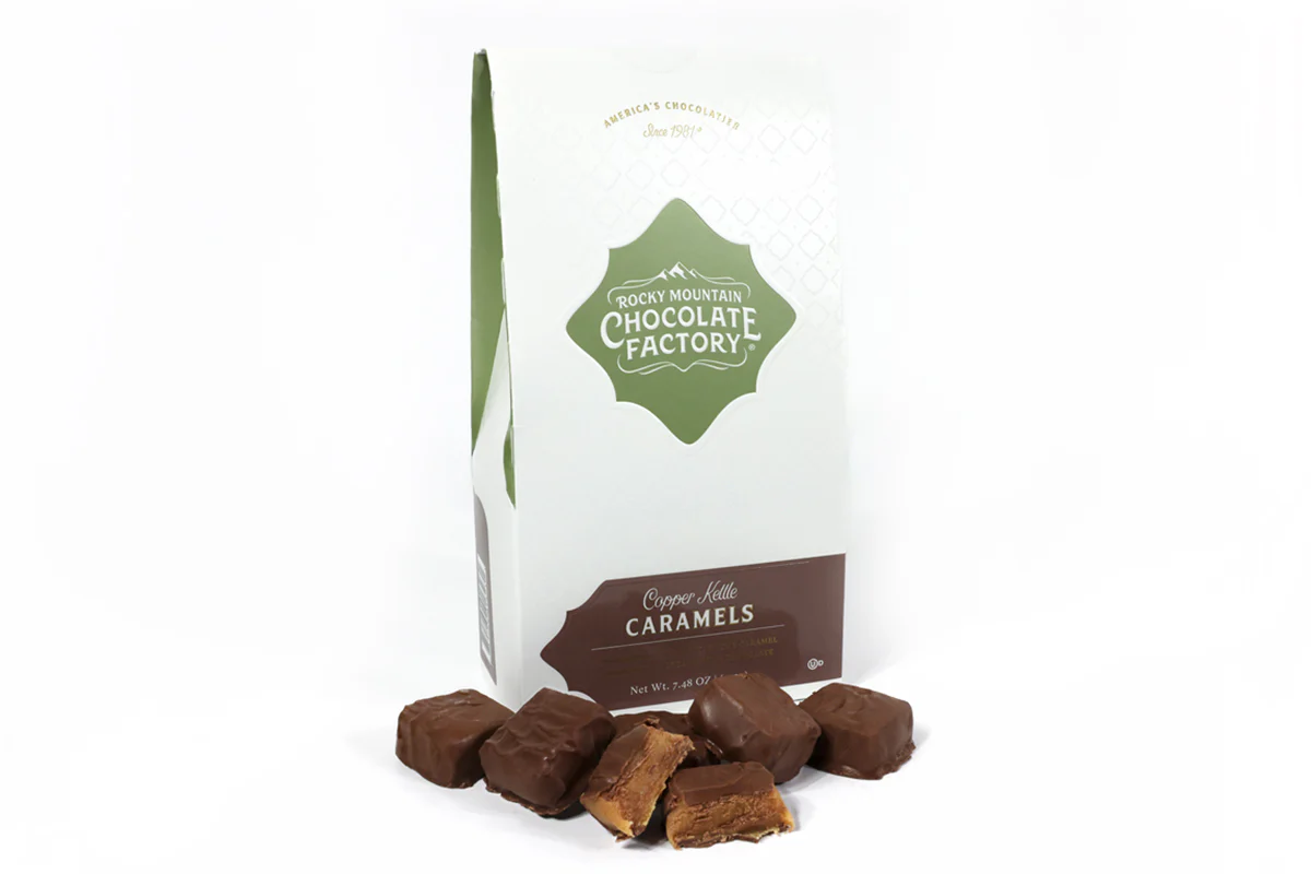 individually wrapped bite-size chewy vanilla caramels coated in milk chocolate in a convenient tote. 7.48 oz.